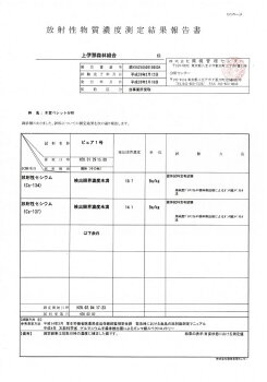 放射性物質濃度測定が行われ、放射性セシウム (Cs-134)、放射性セシウム(Cs-137)について、検出限界濃度以下であったことが報告されています。