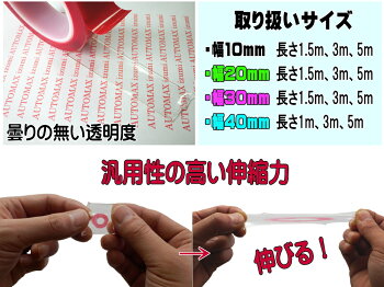 幅10mm×長さ1.5m幅10mm×長さ3m幅10mm×長さ5m幅20mm×長さ1.5m幅20mm×長さ3m幅20mm×長さ5m幅30mm×長さ1.5m幅30mm×長さ3m幅30mm×長さ5m幅40mm×長さ1m幅40mm×長さ3m幅40mm×長さ5mISO9001(品質マネジメントシステム国際規格)ISO14001(環境マネジメントシステム国際規格)TS16949(自動車産業品質マネジメントシステム国際規格)他、様々な国際的な認証規格を証明された高品質な工場で生産された両面テープです。