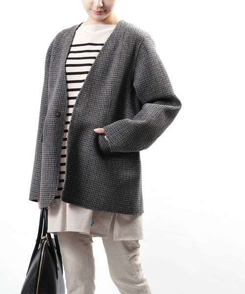 肩パットを使用せず、襟も付けないことでカーディガンのように羽織って頂けます。