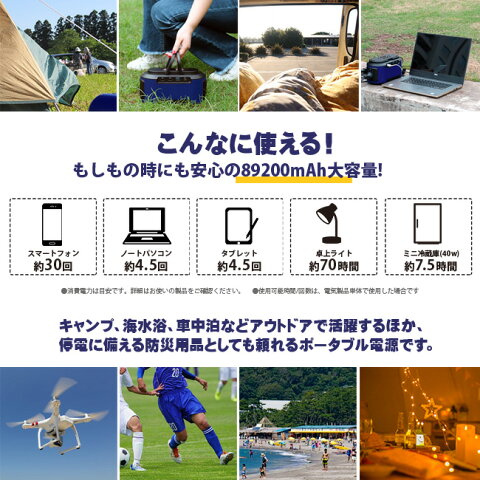 安心の国内メーカー、1年間の品質保証付き! 【必須事項】 ※長期保管される場合は半年に1度、電池容量の2/3から半分程度になるまで必ず補充電して下さい 【AQ710SB仕様】 型番:AQ710SB 電池容量:444Wh(120000mAh 3.7V) 製品サイズ:296×94×196mm 重量:約4.6Kg 内蔵バッテリー:高品質リチウムポリマー電池 充電:ACアダプタ:DC15V/2A 充電時間:DC15V/6A:約11〜12時間 [USB出力] *5V/3.1Ax3 *USB Type_C:5/9/12/15/20V/2A MAX×1 *USB Type_C:5V/3.1A×1 [DC出力] *DCプラグ(5.5/2.1mm)出力:9〜12.6V/10A(合計最大15A)x3 *シガーソケット出力:9〜12.6V/10A(合計最大15A)x1 *AC出力:純正弦波の出力…AC出力:100〜240V 出力周波数:50/60Hz ※AC出力電圧と周波数が異なる国・地域によって出力は変化します。