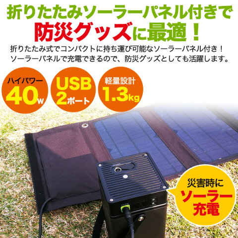 ■40W折りたたみソーラーパネル付きで防災グッズに最適! 折りたたみ式でコンパクトに持ち運び可能なソーラーパネル付き! ソーラーパネルで充電できるので、防災グッズとしても活躍します。