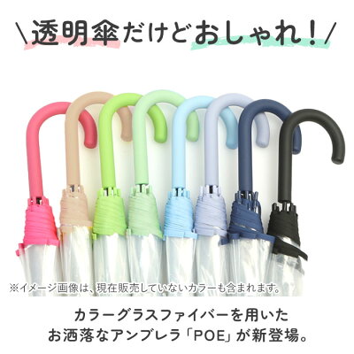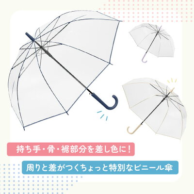 ・傘生地には透明なポリエチレン素材を使い、裾部分を持ち手や骨と同色のバイアスでトリミングしたこだわりのデザイン!・持ち手もマットな仕上げで高級感のある雰囲気に。