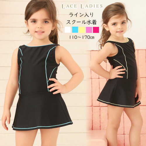 女児 スカート ワンピース ライン スクール水着 ガールズ 女子 Aライン ホワイト ブルー イエロー ピンク チェリーピンク 女の子 水着 ジュニア 110 120 130 140 150 160 170 送料無料